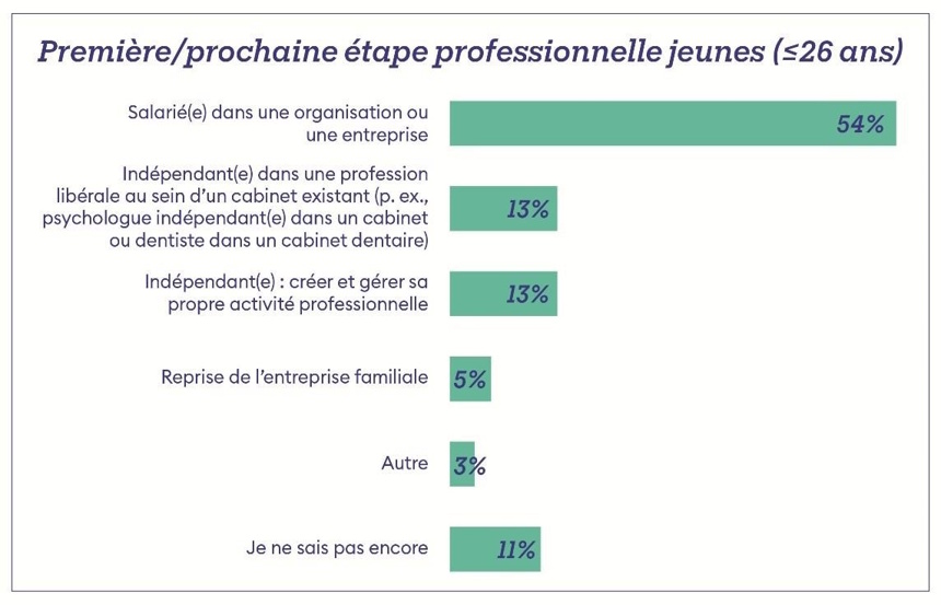 Parmi ces jeunes starters, 13% envisagent d'exercer une profession libérale, 13% de créer leur propre entreprise et 5% veulent reprendre l'entreprise familiale. Si l'esprit d'entreprendre est très présent chez les jeunes, la majorité d'entre eux (54%) indiquent vouloir travailler pour une organisation en tant qu'employé après l'obtention de leur diplôme.
