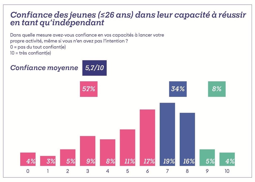 C'est qu'il faut un minimum de confiance en soi pour sauter le pas vers le statut d'indépendant. C'est là que le bât blesse pour la génération Z: ils sont en effet 57% à se donner une note de 6/10 quant à leur capacité à gérer avec succès leur propre entreprise.